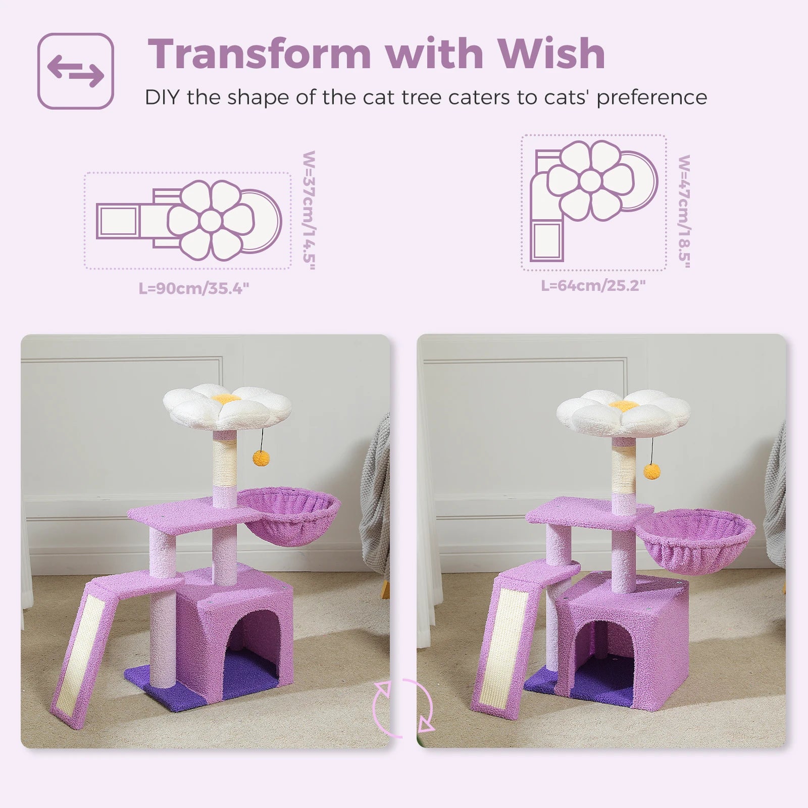 1.TRANSFORM INTO A DIFFERENT SHAPE - The base of this cat tree is separate, so you can flip it over to get a different shape that fits in your room corner or on the wall. And it can be easily moved from the living room to the bedroom, so you can easily transport it. Always have the company of your cat. This cat stand has a moderate height and good view, so the owner can play with the cat very comfortably from the bed.