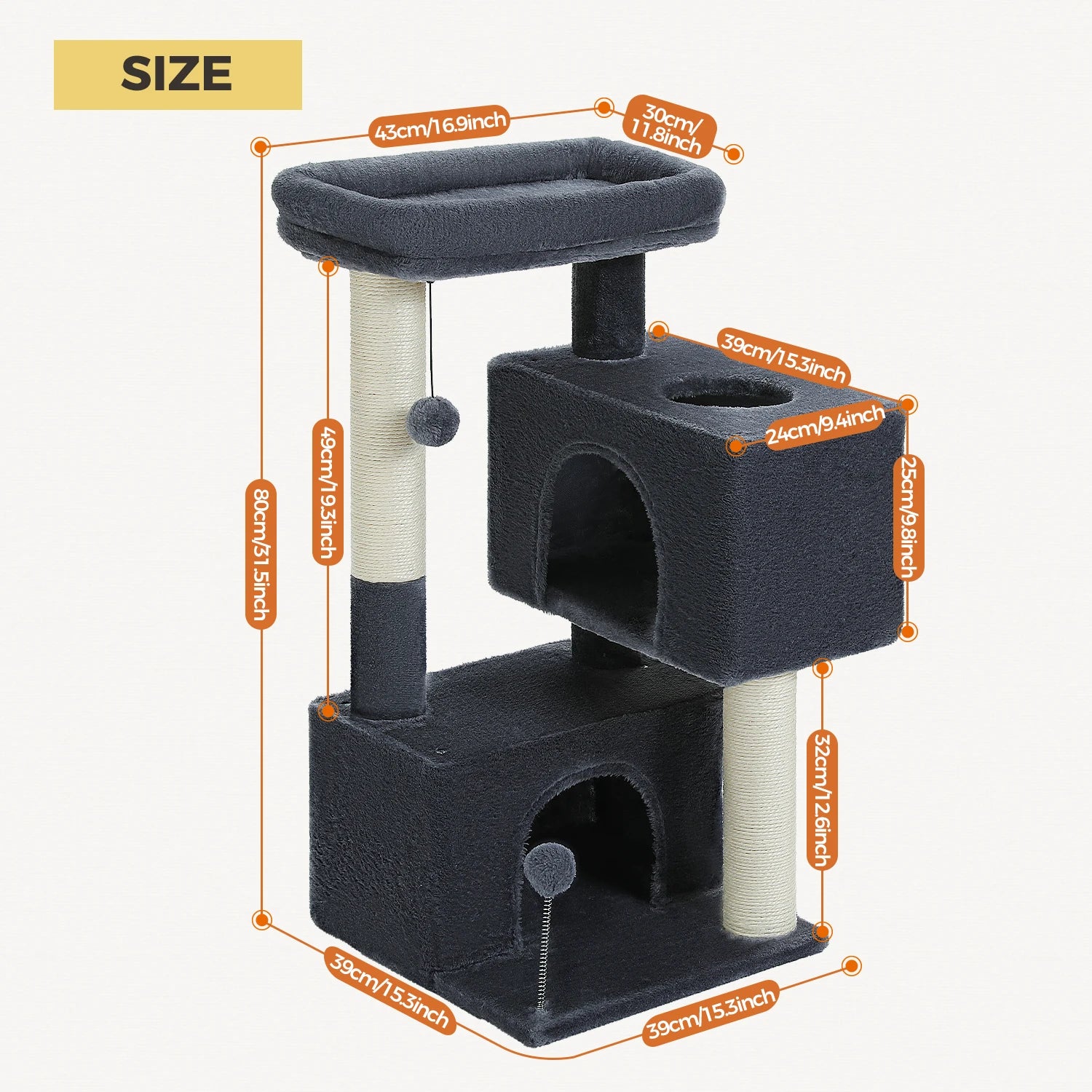 Satisfied Scratching Support: The cat tree for small cats is equipped with 3 natural sisal scratching posts that help keep your cat's claws healthy and prevents them from scratching your furniture. Also the large scratching pad add extra steadiness for the whole cat tower.